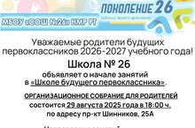 Уважаемые родители будущих первоклассников! МБОУ "Средняя общеобразовательная школа № 26 с углублённым изучением отдельных предметов" НМР РТ объявляет о начале занятий в «Школе будущего первоклассника» со 2 сентября 2025 года.