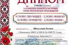 В марте прошёл X Открытый конкурс на лучшее чтение поэтических произведений совместно с МАУ «Дом дружбы народов» НМР , с МОО «Национально-культурной автономией «Украинское товарищество «Вербиченька» — «Вербочка», с МБУ ДО «Станцией детского и юношеского туризма и экскурсий». На этом конкурсе ученица 2Б класса Ибатуллина Ралина исполнила произведение Г.Тукая «Пара лошадей» и получила заслуженный Диплом.