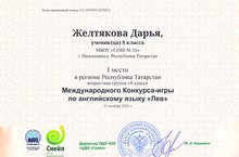 Желтякова Дарья, ученица 8 А класса, проявляет высокие способности в изучении английского языка, она участвует в различных дистанционных конкурсах и олимпиадах всероссийского, регионального и муниципального масштаба. Она является победителем осеннего и зимнего этапов Республиканской очной олимпиады "Win kid-2020", победителем Международного конкурса игры "Английский лев - 2020" и призером Межрегиональной предметной олимпиады КФУ по профилю "Английский язык". Учитель английского языка: Вьюкова В.В.