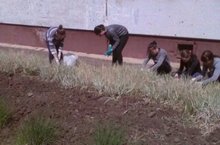 Учителя и ученики вышли на субботник, собрали всю сухую траву и листья в мусорные мешки. Перекопали приствольные круги деревьев. Подмели асфальтовые дорожки.