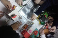 Они приняли участие в мероприятии "Дорога БЕЗ опасности". Вот такой макет улицы они смастерили на уроке: улица с проезжей частью, дома в ряд и, конечно, уютный двор. Всё знакомо: "пешеходный переход", поребрик, тротуар и дорога с двусторонним движением.