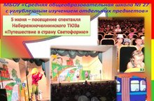 В рамках акции "Внимание-дети!" пришкольный лагерь посетил спекталь Набережночелнинского ТЮЗа "Путешествие в страну светофорию". Представление было интересным, с играми, танцами. Но самое главное ребята вместе с героями сказки повторили правила дорожного движения.