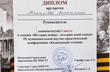 Поздравляем ученицу 9А класса Макарову Анастасию (педагог Мискинова Айгуль Шавкатовна) с дипломом за 1 место в IX муниципальной научно-практической конференции "Казаковские чтения" в секции "История войны - история моей семьи". Молодцы! Так держать! Школа гордится вашими успехами!