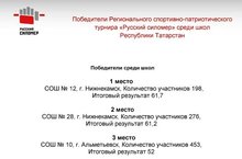 Поздравляем нашу школу - победителя Регионального спортивно-патриотического турнира "Русский силомер" среди школ Республики Татарстан. У нашей школы почетное 2 место! Количество участников - 267. Итоговый результат - 61,2. Особые слова благодарности мы выражаем учителям физической культуры Завалиной Татьяне Ивановне и Закирову Фирзару Минсабировичу! Молодцы! Так держать! Школа гордится вами!