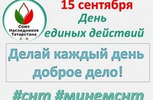 15 сентября – день создания Республиканской общественной организации «Союз наследников Татарстана» (СНТ). Союз – наследник и продолжатель исторических традиций пионерского и детского движения, живущий под девизом «Делай каждый день доброе дело!», отстаивающий нерушимые ценности Родины, Добра и Справедливости, процветает и крепнет!