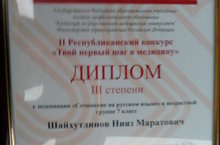 В Казанском Государственном медицинском университете прошло торжественное награждение участников II Республиканского конкурса «Твой первый шаг в медицину». На мероприятие были приглашены Шайхутдинов Нияз и педагог Баклан Светлана Леонидовна. Мы поздравляем Светлану Леонидовну и Нияза с дипломом III степени в номинации «Сочинение на русском языке». Молодцы! Школа гордится вами!