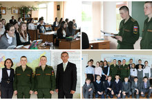 Сегодня в Нижнекамском муниципальном районе проведена общегородская акция «Нижнекамск – город патриот, Нижнекамск – город патриотов». В город прибыли военнослужащие 154-го стрелкового комендантского Преображенского полка (г.Москва), рота почетного караула и духового оркестра Казанского высшего военного командного училища, артисты ансамбля песни и пляски РВСН «Красная Звезда». В гостях в нашей школе побывали курсанты роты почетного караула Казанского высшего военного командного училища Фатхуллин Руслан и Лыга Василий.