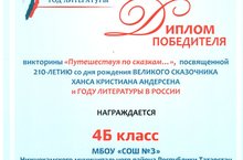 ПОЗДРАВЛЯЕМ 4 "Б" КЛАСС С ПОБЕДОЙ В ГОРОДСКОЙ ВИКТОРИНЕ "ПУТЕШЕСТВУЯ ПО СКАЗКАМ...", ПОСВЯЩЕННОЙ 210 - ЛЕТИЮ СО ДНЯ РОЖДЕНИЯ ВЕЛИКОГО СКАЗОЧНИКА ХАНСА КРИСТИАНА АНДЕРСЕНА И ГОДУ ЛИТЕРАТУРЫ В РОССИИ!!!