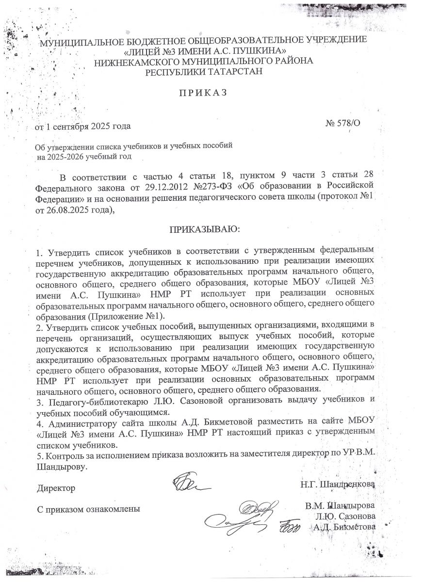 Приказ по МБОУ "Лицей №3 имени А.С Пушкина" НМР РТ "Об утверждении списка учебников и учебных пособий на 2025-2026уч.год"