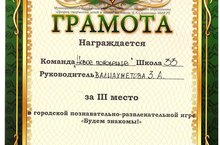 Поздравляем команду "Новое поколение" - ребят 3а класса с III местом в городской познавательно-развлекательной игре "Будем знакомы!" Во время игры ребятам предстояло найти ответы на очень серьезные вопросы: государственные символики республики Татарстан, направления деятельности СНТ...