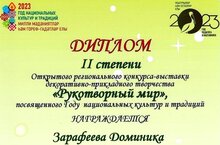 Поздравляем победителей и участников Регионального конкурса "Рукотворный мир". Дипломом II степени награждена Зарафиева Доминика, дипломом III степени - Пушкина Евгения, дипломом в номинации "За творческий подход" - Сыпопятов Илья. Остальные участники получили сертификаты (учитель Глухарева Ирина Сергеевна).