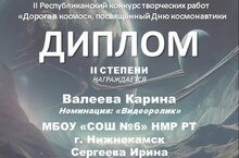 Ученица Татнефть-класса Валеева Карина награждена дипломом II степени в номинации "Видеоролик" Республиканского конкурса творческих работ "Дорога в космос", посвящённого Дню космонавтики.