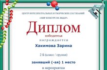 Поздравляем Хакимову Зарину, занявшую I место во II Всероссийской дистанционной олимпиаде "Нескучная анатомия. Здоровье человека" и Пономареву Вилену, занявшую III место в Международной дистанционной олимпиаде по логике (учитель начальных классов Миргасимова Гульназ Фаварисовна).