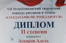 Поздравляем ученика 9Б класса Аскарова Аделя, получившего диплом II степени Республиканского конкурса рисунков и чтецов "Солдатами не рождаются" (учитель Шайдуллина Танзиля Рахимулловна).
