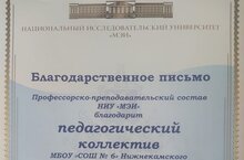 Благодарственное письмо коллектив нашей школы получил от профессорско-преподавательского состава НИУ "МЭИ". Институт благодарит наших учителей за высокий уровень подготовки выпускников, педагогическое мастерство, большой вклад в воспитание подрастающего поколения и сообщает, что наша выпускница Махмутова Яна закончила два семестра с отличным результатом. Нам очень приятно получать подобные отзывы о результатах нашей работы.