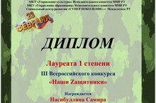 В Год защитника Отечества, в рамках месячника гражданско-патриотического воспитания диплом лауреата I степени III Всероссийского конкурса "Наши Zащитники" получила ученица 5А класса Насибуллина Самира (учитель Зиганшина Венера Гависовна).