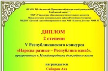 В рамках месячника родных языков прошел V Республиканский конкурс "Народы разные - Республика одна!", в котором ученик 6Б класса Сабиров Аяз получил диплом II степени в номинации "Каждый талантлив по своему". Сабиров Аяз представил на конкурс свою работу, посвященную Мусе Джалилю (учитель Зиганшина Венера Гависовна).