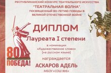 Поздравляем ученика 9Б класса, воспитанника школьной театральной студии Аскарова Аделя, ставшего лауреатом I степени Республиканского конкурса театрального искусства "Театральная волна" в номинации "Художественное слово" (руководитель театральной студии Шайдуллина Танзиля Рахимулловна).