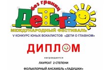 Воспитанники детского фольклорного объединения "Ладушки" Дворца творчества детей и молодёжи имени И.Х. Садыкова, ученики 1А класса нашей школы стали обладателями почётного Диплома лауреата II степени Межрегионального конкурса юных вокалистов "Дети о главном" в рамках Международного фестиваля "Детство без границ" (педагоги - Шернина Наталья Николаевна (ДТДиИ им.И.Х. Садыкова) и классный руководитель 1А класса Алиева Ольга Германовна).