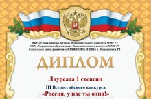 Поздравляем обучающуюся 8Б класса Кузьмину Анастасию, ставшую лауреатом I степени III Всероссийского конкурса "Россия, у нас ты одна!" в номинации "Лучше нет родного края" (учитель родного языка и литературы Зиганшина Венера Гависовна). Лауреатом I степени в номинации "Социальный ролик" этого же конкурса стала учитель математики Дорофеева Лилия Ильинична.