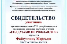 Активное участие в муниципальном этапе Республиканского конкурса рисунков и чтецов "Солдатами не рождаются" приняли обучающиеся нашей школы: Файзуллин Мерсель (6В), Шафигуллина Азалия (7А), Ардисланов Ильсаф (3А), Исламгалиев Роберт (3Г). Все участники получили сертификаты.