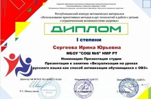 Учитель русского языка и литературы Сергеева Ирина Юрьевна стала победителем Республиканского конкурса методических материалов "Использование проективных методов и арт-технологий в работе с детьми с ограниченными возможностями здоровья".