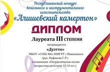 Поздравляем вокальный коллектив "Дуэтто" (Бикбаев Шамиль 8А и Файзуллин Марсель 6В), ставший лауреатом III степени Республиканского конкурса вокального и инструментального исполнительства "Алишевский камертон" (учитель музыки Нафикова Гульназ Райхановна).
