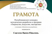 Учитель русского языка и литературы Сергеева Ирина Юрьевна и учитель математики Миннегалиева Раиля Хамитовна приняли участие в Республиканском конкурсе методических разработок и программ "Творчество, искусство, мастерство" в номинации "Методическая разработка" и награждены грамотами "За творческий подход".