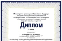 Поздравляем Шамсиеву Алсу, занявшую I место в Региональной научно-практической конференции с международным участием "Педагог. Учёный. Писатель" (учителя Зиганшина Венера Гависовна, Шайдуллина Танзиля Рахимулловна).