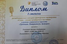 Поздравляем Гилязеву Аделину, занявшую I место в Республиканском конкурсе ораторского мастерства "Слово - основа культурного наследия" в рамках социального проекта "Традиции. Патриотизм. Будущее" (учитель Сергеева Ирина Юрьевна).