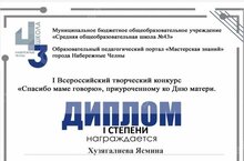 Поздравляем обучающую 3Б класса Хузягалиеву Ясмину, занявшую I место во Всероссийском творческом конкурсе "Спасибо маме говорю", приуроченному ко Дню матери (учитель Зиганшина Венера Гависовна).
