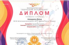 Поздравляем ученицу 1А класса Ахмадиеву Диану, ставшую лауреатом I степени Международного фестиваля-конкурса "Творческий калейдоскоп" в номинации "Изобразительное искусство".