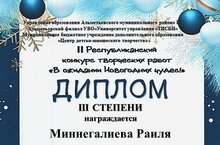 Поздравляем учителя математики Миннегалиеву Раилю Хамитовну, занявшую III место в II Республиканском конкурсе творческих работ "В ожидании Новогодних чудес" в номинации "Методическая разработка". Организатор конкурса - университет управления ТИСБИ.