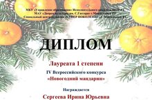 Учитель русского языка и литературы Сергеева Ирина Юрьевна награждена дипломом лауреата I степени Всероссийского конкурса "Новогодний мандарин".