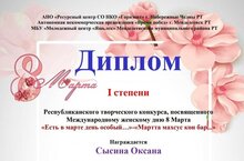 Поздравляем победителей Республиканского творческого конкурса, посвященного Международному женскому дню 8 Марта "Есть в марте день особый...": дипломантов 1 степени в номинации "Вокальное и музыкальное искусство " - Сысину Оксану и Салахова Азата (учитель Нафикова Гульназ Райхановна), дипломанта 1 степени в номинации "Кулинарный шедевр" - Адылева Камиля (учитель Хабарова Айгуль Миншакировна).