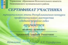 19 января на базе МБОУ ППМС "ЦДиК" НМР РТ был проведен муниципальный этап Республиканского конкурса профессионального мастерства "Педагог-психолог года", в котором приняла участие Архипова Альбина Ринатовна.