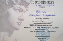 Сертификат участника образовательной программы "Творческая школа. Модуль 1" в ФГБОУ "СПГАХЛ им. Б.В. Иогансона при Российской Академии художеств" получила ученица 8А класса Иванова Екатерина.