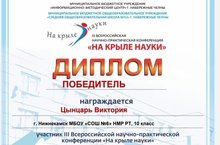 Поздравляем Цынцарь Викторию, ставшую победителем III Всероссийской научно-практической конференции "На крыле науки" (учитель Сергеева Ирина Юрьевна).