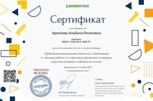 8 октября 2022 года педагог-психолог Архипова Альбина Ринатовна просмотрела вебинар "Публичная консультация психолога. Самопомощь и техники работы со стрессом в кризисных ситуациях: агрессия, влияние, особенности толпы", с получением сертификата.