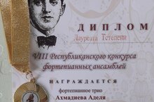 Дипломом лауреата первой степени Республиканского конкурса фортепианных ансамблей награжается фортепианное трио, в состав которого вошла ученица 7А класса Ахмадиева Аделя.