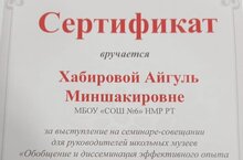 В Международный день музеев 18.05.2022 г. для руководителей школьных музеев на базе ТКК состоялся информационно-методический семинар-совещание "Обобщение и диссеминация эффективного опыта работы музейных формирований и их руководителей в области воспитания и дополнительного образования детей". На семинаре с опытом музейной работы выступила руководитель литературно-краеведческого музея имени Рашита Гарая школы №6 Хабирова Айгуль Миншакировна.