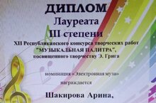 Поздравляем Шакирову Арину, обучающуюся 7Б класса, лауреата третьей степени Республиканского конкурса творческих работ "Музыкальная палитра"(учитель Саттарова Алина Салаватовна).