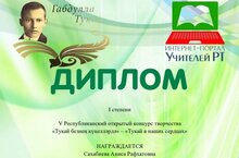 Поздравляем Иванову Юлию, занявшую первое место в Республиканском открытом конкурсе творчества "Тукай в наших сердцах" (учителя Сахабиева Аниса Рафкатовна, Глухарева Ирина Сергеевна). Диплом первой степени завоевала учитель родного языка и литературы Сахабиева Аниса Рафкатовна, которая направила на конкурс презентацию.