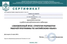 Учитель английского языка школы №6 Саттарова Алина Салаватовна приняла участие в работе Республиканского вебинара "Обновленный ФГОС: стратегия разработки программы по английскому языку".