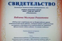 Учитель начальных классов школы №6 Набиева Милеуша Рашидовна обобщила и представила на всероссийском уровне педагогический опыт работы, который прошел редакционную экспертизу и доступен на страницах официального сайта издания "Альманах педагога".