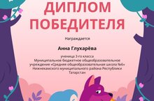 Поздравляем обучающуюся 3А класса школы №6 Глухареву Анну, победителя Всероссийской онлайн-олимпиады по финансовой грамотности и предпринимательству для 1-9 классов (учитель Ильязова Гульназ Наилевна).