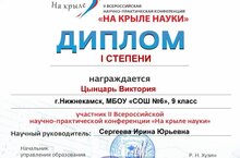Поздравляем обучающуюся 9Б класса Цынцарь Вику, занявшую первое место во Всероссийской научно-практической конференции "На крыле науки". Конференция прошла на базе Набережночелнинского педагогического университета (учитель Сергеева Ирина Юрьевна).