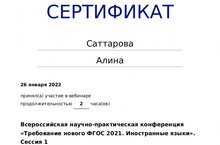 Учитель английского языка школы №6 Саттарова Алина Салаватовна приняла участие во Всероссийском вебинаре издательства "Просвещение" по теме "Требование нового ФГОС 2021. Иностранные языки".