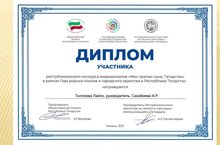 Диплом участника республиканского конкурса видеороликов, посвященного Республике Татарстан, получила обучающаяся 6 в класса школы 6 Тиллоева Лайло - учитель Сахабиева Аниса Рафкатовна)
