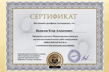 Международный конкурс научно - исследовательских работ школьников "Школьная наука" 27.12.2020 Поздравляем Яковлева Егора, участника Международного конкурса научно - исследовательских работ школьников "Школьная наука" в номинации "Биологические исследования"